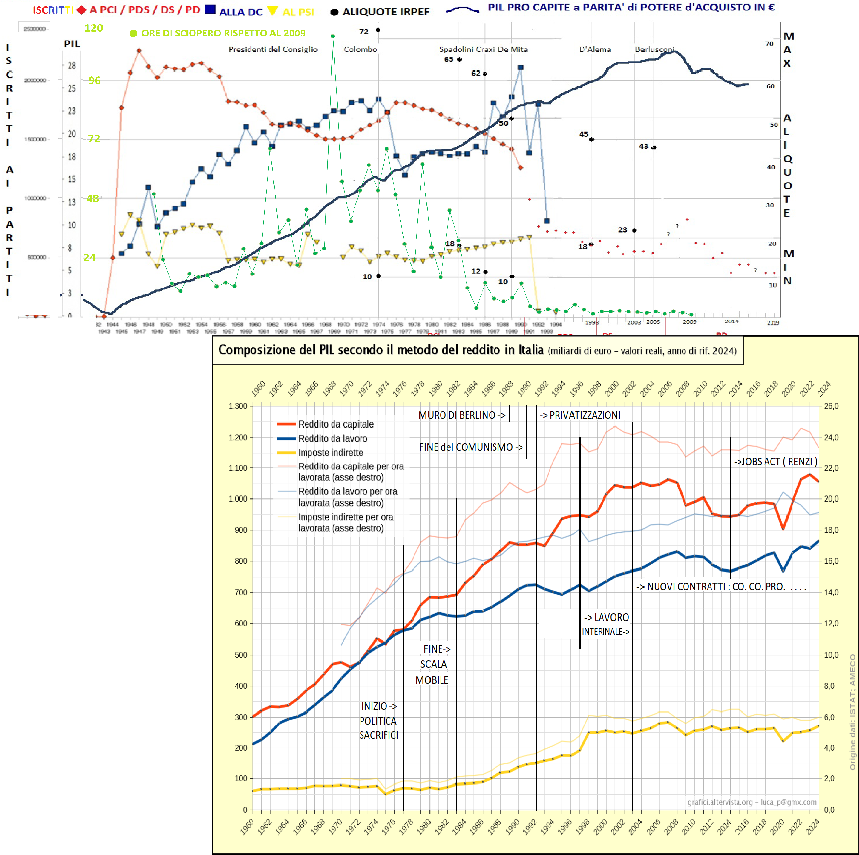 dopo Tangentopoli ( Mani Pulite – 1992 ) : DC e PSI scompaiono , gli iscritti di PCI-PDS-DS-PD continuano a diminuire , le ore di sciopero diventano quasi irrilevanti ; dopo il 2009 il PIL comincia a diminuire e l'ISTAT non tiene più conto delle ore di sciopero effettuate ;